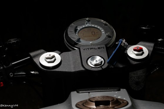Leaving the parking lot, a bit of finesse is needed when controlling the short clutch lever and below 3000 rpm it typically bucks quite strongly. However once passed those rpm’s the Vitpilen fluently races through the range. That is until the limiter warning light starts flashing . A tad later the limiter itself kicks in quite harshly. Both the warning light as well as the limiter are adjustable.