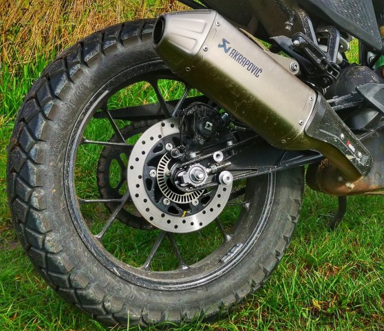 My test bike was equipped with loads of accessories from the Power Parts catalogue to make it more offroad-worthy ,such as a flat rallyseat, aluminum handguards, a skid plate and a radiator grill. The Akrapovic exhaust looks a lot cooler than the standard boxy exhaust, which takes care of the only part on this motorcycle that’s really not nicely designed. It has a quickshifter too, both up and down. On a four hundred! Sweet!