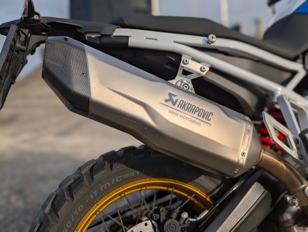 The suspension is set up pretty firm out of the box, but it delivers tons of feedback. The 900cc parallel-twin really shines in this GS. Smooth throttle control, plenty of torque and a punchy midrange that lets you flick from corner to corner with confidence, while the burbles and pops from the optional Akrapovič exhaust tempt you to keep shifting up and down, just for the fun of it.